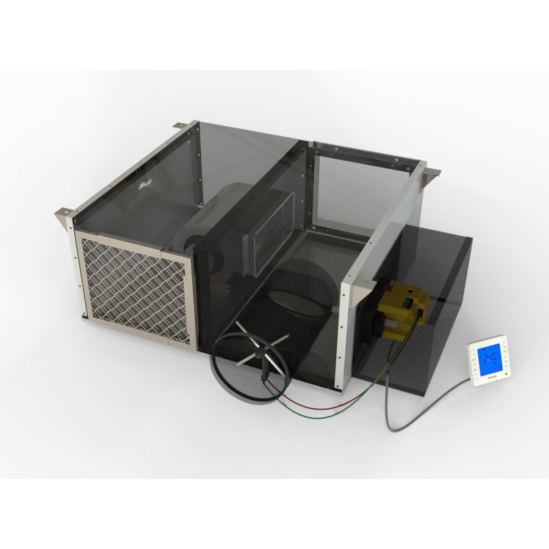 箱體部分包括殼體、一次進(jìn)風(fēng)口(圓筒形)、風(fēng)速傳感器、末端風(fēng)機(jī)(風(fēng)機(jī)動(dòng)力型)、風(fēng)閥、吊耳、電控箱、回風(fēng)過濾網(wǎng)(動(dòng)力型)、內(nèi)敷保溫消聲棉以及可選配部件(如熱水盤管、熱水盤管電動(dòng)閥、電加熱盤管、出風(fēng)靜壓箱、消聲器)等。